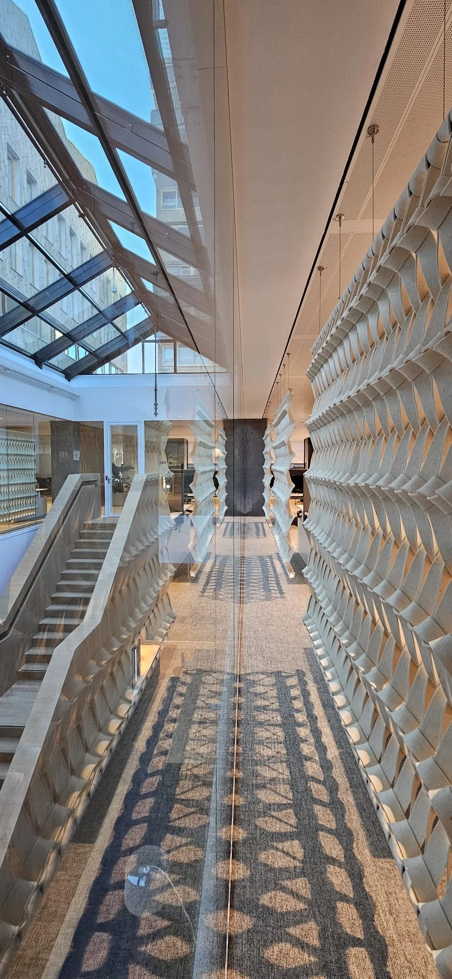 Layering the Plectere panels along the atrium glas wall
